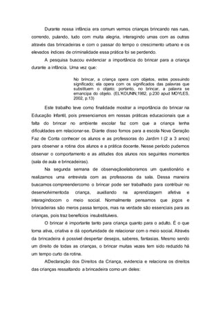 1) O documento discute a importância do brincar na educação infantil para o desenvolvimento integral da criança.