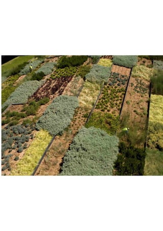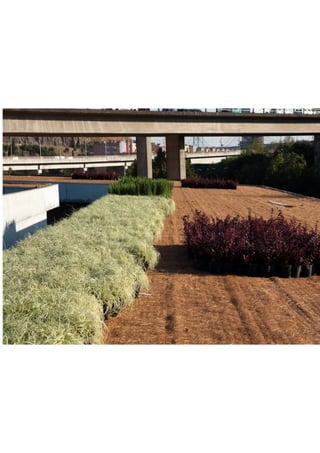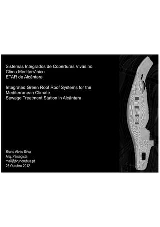 O documento apresenta uma análise sobre sistemas integrados de coberturas vivas na ETAR de Alcântara, enfocando interações com o clima mediterrânico e as oportunidades que surgem com a biofiltragem e a biodiversidade. Discute também os desafios de acessibilidade e didatismo, além de apresentar propostas de recuperação paisagística e serviços ambientais. A pesquisa inclui referências a projetos similares e a importância do usufruto comunitário.