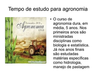 O documento descreve a profissão de agrônomo, definindo-a como o conjunto de conhecimentos usados para planejar e gerenciar atividades rurais desde o cultivo até a administração. Discorre sobre o tempo de estudo de 5 anos em agronomia e as matérias estudadas, além das oportunidades de mercado de trabalho e salários médios da profissão.