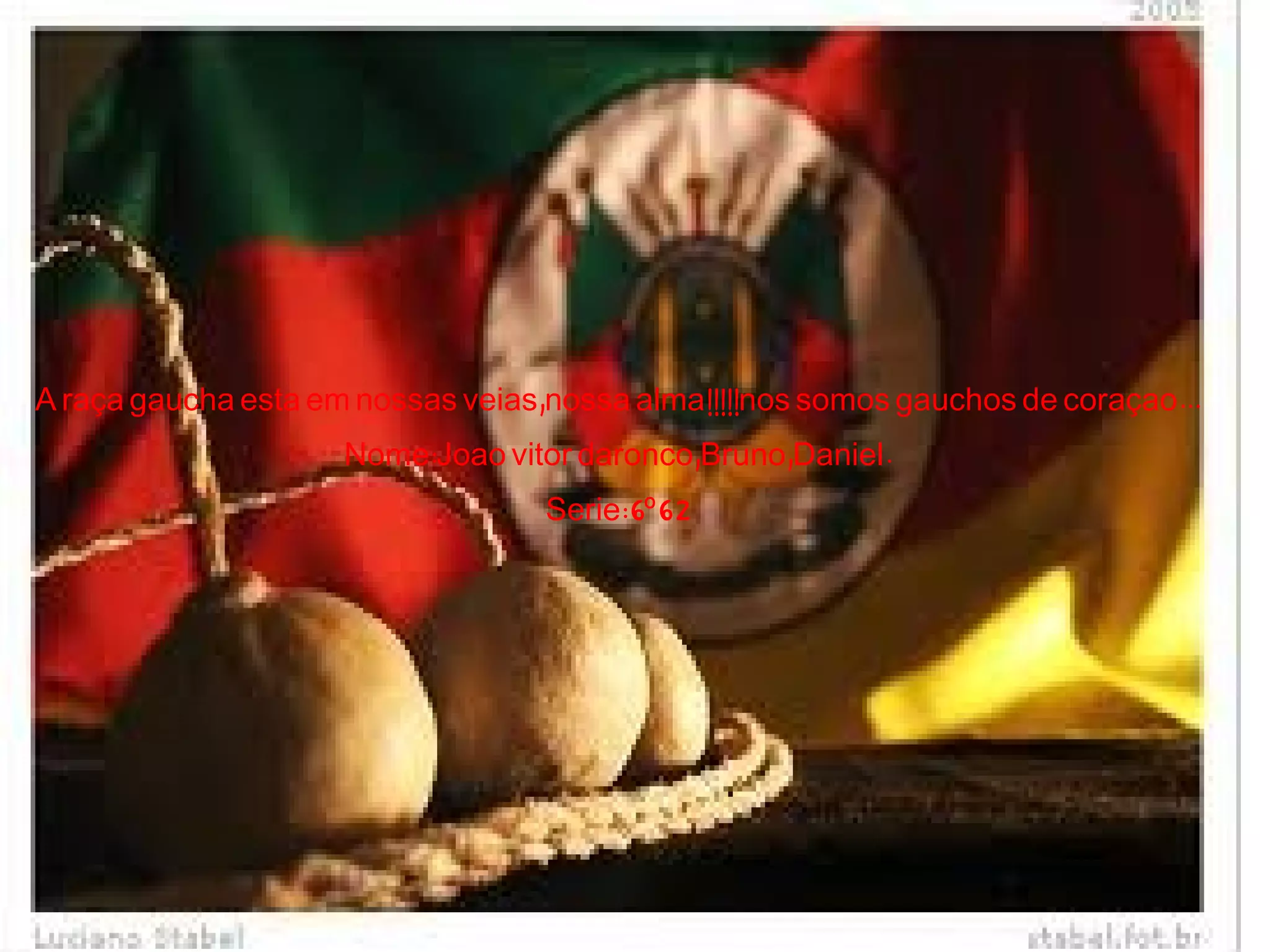 A raça gauchaesta em nossas veias,nossa alma!!!!!nos somos gauchos de coraçao... Nome:Joao vitor daronco,Bruno,Daniel. Serie:6º62