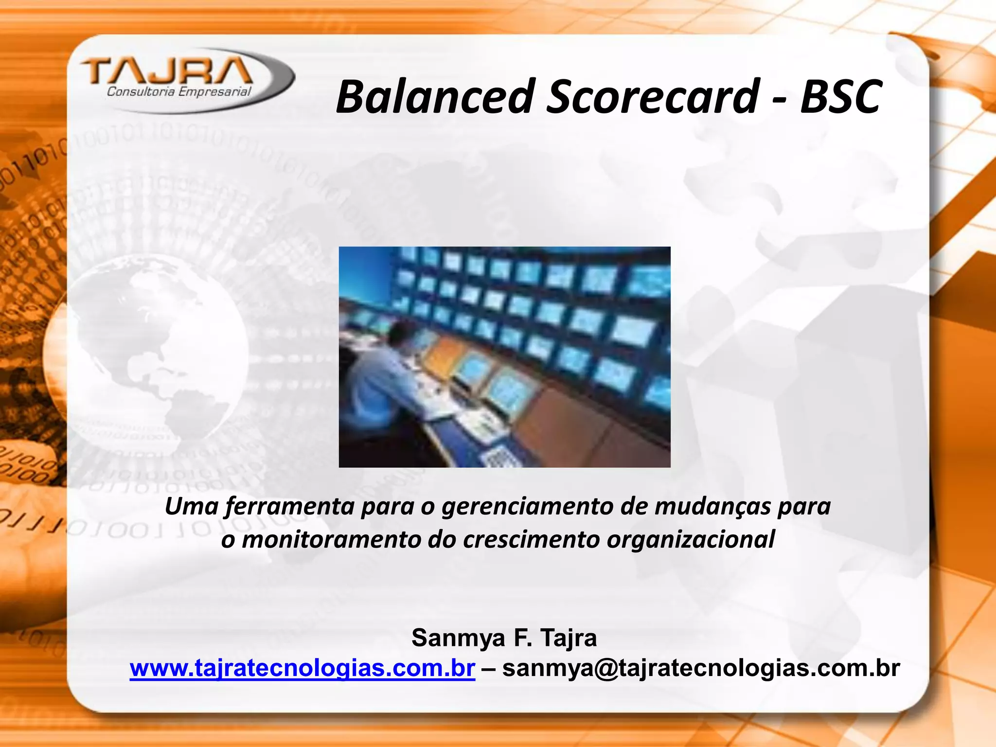 O documento discute o Balanced Scorecard (BSC) como uma ferramenta para traduzir a estratégia organizacional em objetivos e medidas de desempenho. O BSC avalia o desempenho da organização em quatro perspectivas: financeira, clientes, processos internos e aprendizado e crescimento. Cada perspectiva contém objetivos e indicadores que quando alinhados apoiam o cumprimento da estratégia e geração de valor a longo prazo para a organização.