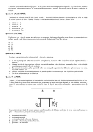 O documento contém 20 questões sobre óptica geométrica, incluindo conceitos como formação de imagens em espelhos planos e câmeras escuras, leis da reflexão e incidência, sombras e penumbras. As questões abordam cálculos envolvendo distâncias, ângulos e alturas para estimar ou determinar grandezas geométricas a partir de esquemas e figuras apresentadas.