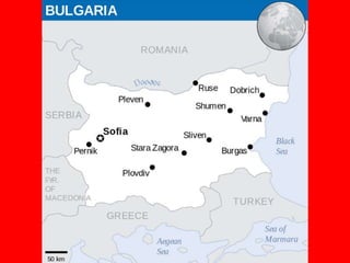 A Bulgária está localizada na Península Balcânica. Sua capital é Sofia e sua população inclui búlgaros, turcos e ciganos, que falam búlgaro, turco e macedônio. A Bulgária tem uma longa história que inclui domínios romano e otomano, e hoje é um país independente com uma economia em crescimento.