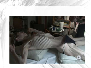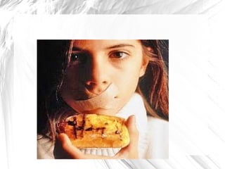 A bulimia nervosa é um transtorno alimentar caracterizado pela ingestão compulsiva de grandes quantidades de alimentos seguida de métodos para evitar ganho de peso, como vômitos ou uso de laxantes. A anorexia nervosa é outro transtorno onde a pessoa se vê como gorda e evita comer por medo de engordar, podendo levar a fraqueza. Ambos os transtornos requerem tratamento multidisciplinar para recuperação do peso e saúde mental.