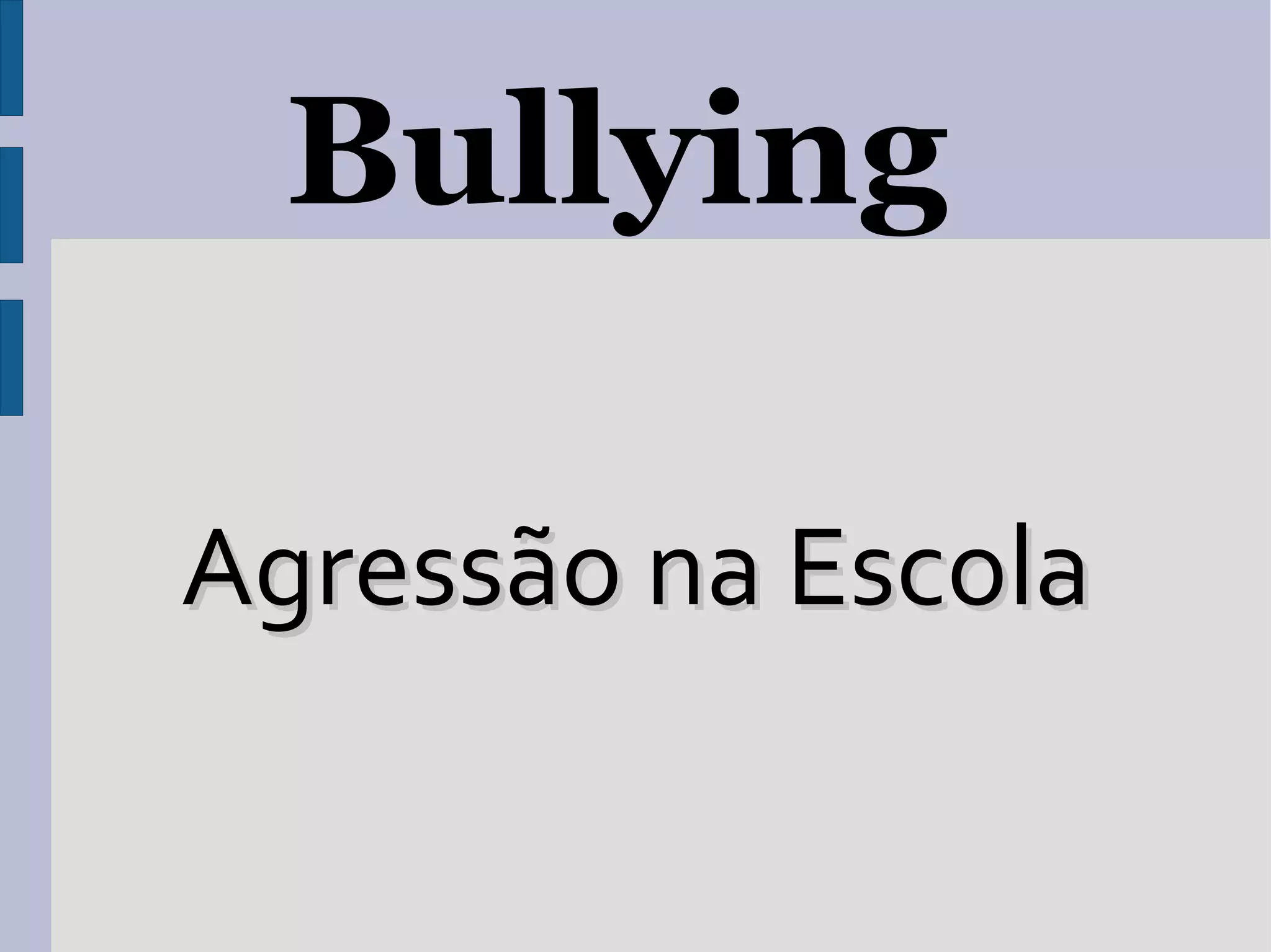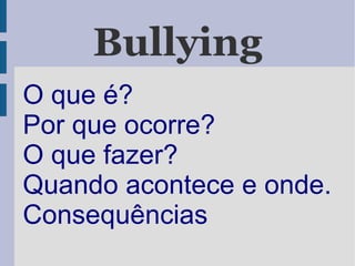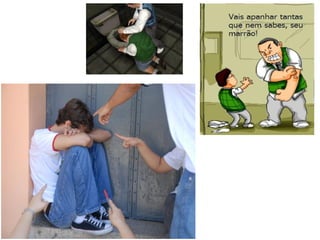 O documento discute o bullying na escola, definindo-o como agressões físicas e morais repetitivas que levam a vítima ao isolamento e depressão. Aponta que mais de 40% dos alunos já praticaram ou foram vítimas de bullying e que ocorre com mais frequência nos pátios de recreio. Também discute as consequências negativas do bullying para a vítima, agressor e ambiente escolar, incluindo depressão e baixa autoestima.