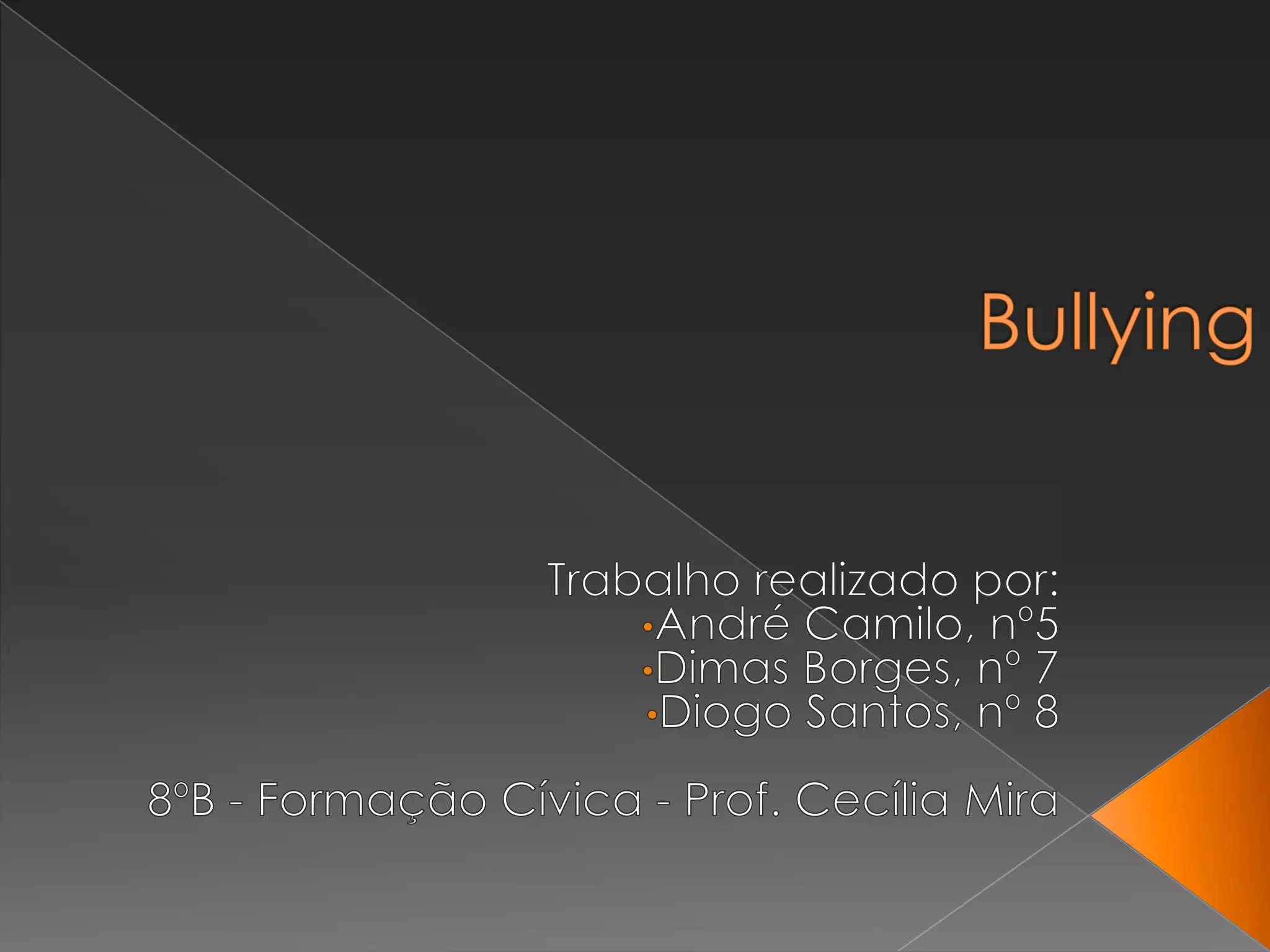 Este documento discute o bullying, definindo-o como atos de violência física ou psicológica intencionais contra outros. Ele descreve as características do bullying, os tipos de bullying direto e indireto, onde ocorre com mais frequência e suas possíveis consequências, incluindo em casos extremos, a morte. O objetivo é conscientizar as pessoas sobre este problema.