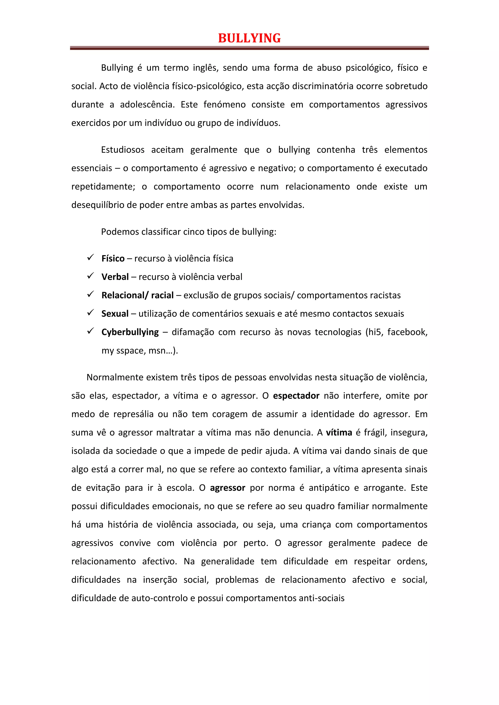 Este documento discute bullying, definindo-o como abuso psicológico, físico e social, geralmente ocorrendo durante a adolescência. Ele descreve cinco tipos de bullying e os papéis de vítima, agressor e espectador. Finalmente, discute intervenções psicopedagógicas focadas na prevenção e no tratamento de agressores e vítimas.