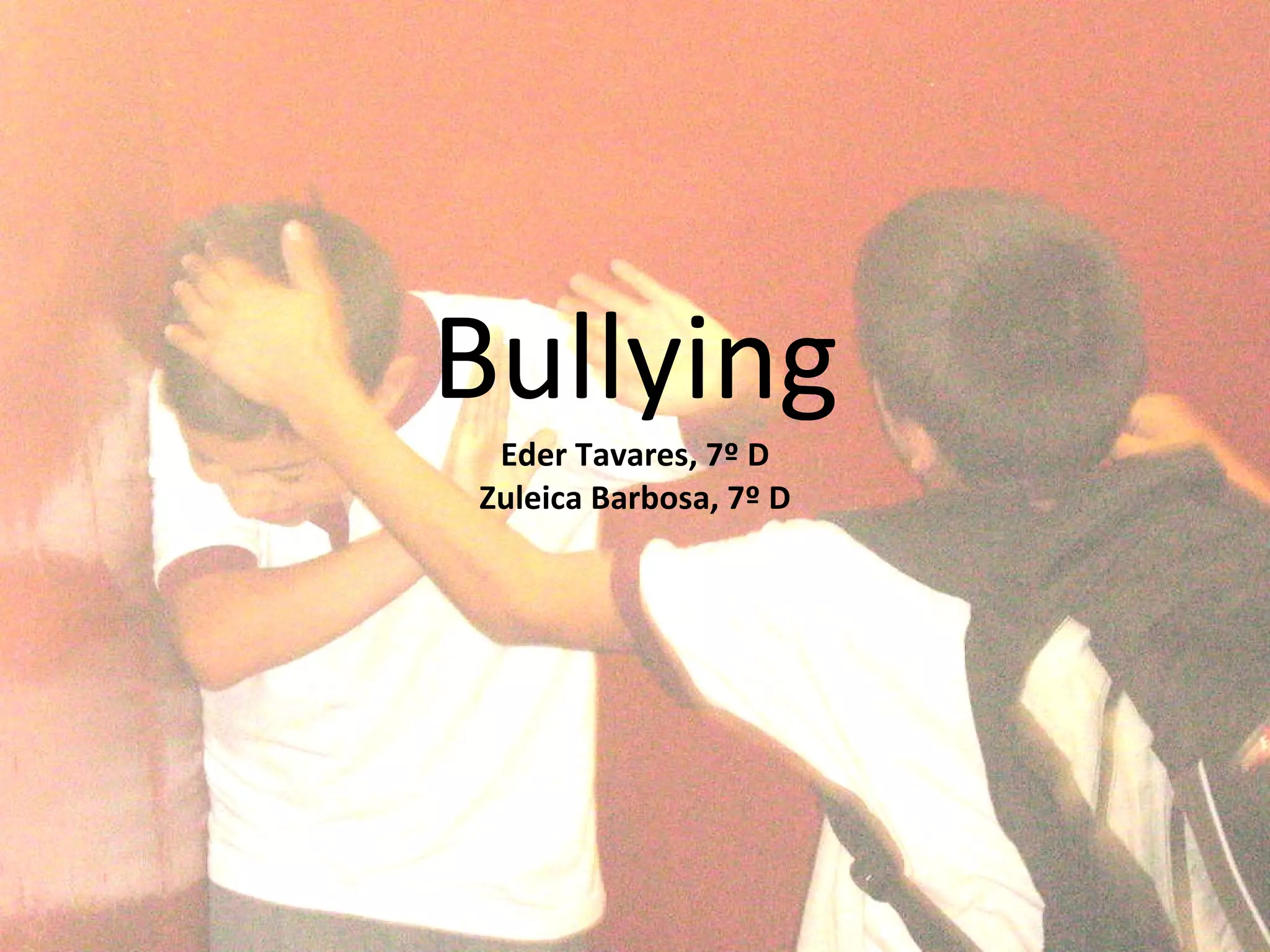 O documento define bullying como agressão exercida individualmente ou em grupo na escola ou sociedade. Descreve os tipos de bullying como físico, emocional, racista e cyberbullying. Lista sinais de bullying como ataques de fúria, sintomas somáticos, isolamento e queda no rendimento escolar. Aponta um caso de uma adolescente americana que cometeu suicídio após sofrer bullying online. Recomenda alertar professores ou pais se suspeitar que alguém está sofrendo bullying.
