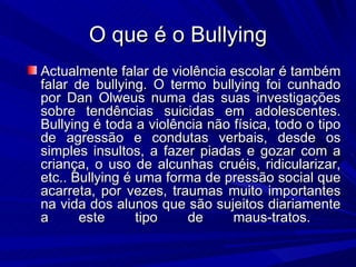 O documento discute o bullying, definindo-o como violência psicológica e verbal contra alunos. Ele descreve os tipos de bullying, como insultos, ataques físicos e isolamento social. Também discute como alunos se envolvem como alvos, autores e testemunhas de bullying e as possíveis consequências para cada grupo, incluindo baixa auto-estima e problemas de relacionamento.