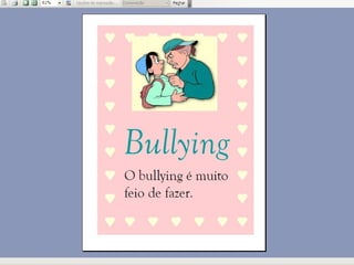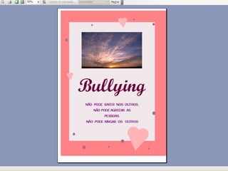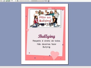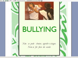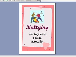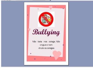 O documento apresenta um trabalho desenvolvido com alunos do terceiro ano sobre bullying. Repete cinco frases dizendo que não se pode agredir outras pessoas, bater nelas, agredir professores, fazer bullying ou maltratá-las.