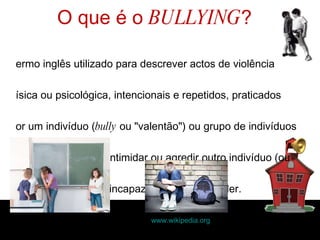Este documento discute o bullying, definindo-o como atos intencionais e repetidos de violência física ou psicológica praticados por um indivíduo ou grupo para intimidar outra pessoa incapaz de se defender. Ele lista formas de bullying, características comuns de vítimas, e exemplos de famosos que também foram vítimas, incluindo as experiências de Victoria Beckham, Christian Bale e Michael Phelps. Finalmente, discute as consequências do bullying e o que as vítimas podem fazer.