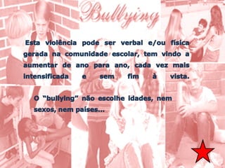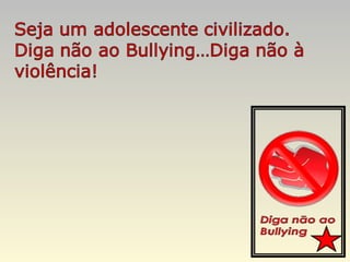 Bullying é violência física ou psicológica praticada por um indivíduo ou grupo contra outro que é incapaz de se defender, causando angústia, medo e depressão que podem levar ao suicídio. Deve-se denunciar os agressores ou mostrar indiferença, e nunca se isolar ou recorrer à automutilação. Cyberbullying também causa danos e seus praticantes podem ser processados. Educar crianças requer dedicação dos pais para prevenir comportamentos de bullying.