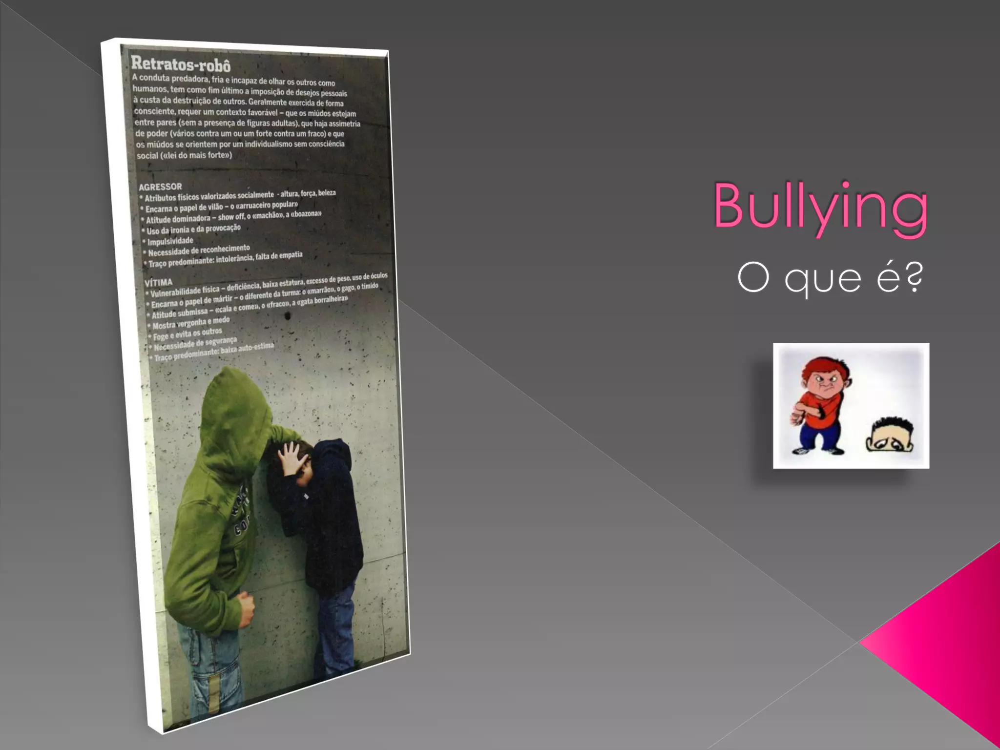 O documento discute bullying, definindo-o como atos de violência física ou psicológica intencionais e repetidos praticados por um indivíduo ou grupo contra outro mais fraco. Descreve formas de bullying direto e indireto e explica que a vítima geralmente tem motivos para temer o agressor devido a ameaças ou violência. Também discute a responsabilidade legal por atos de bullying.