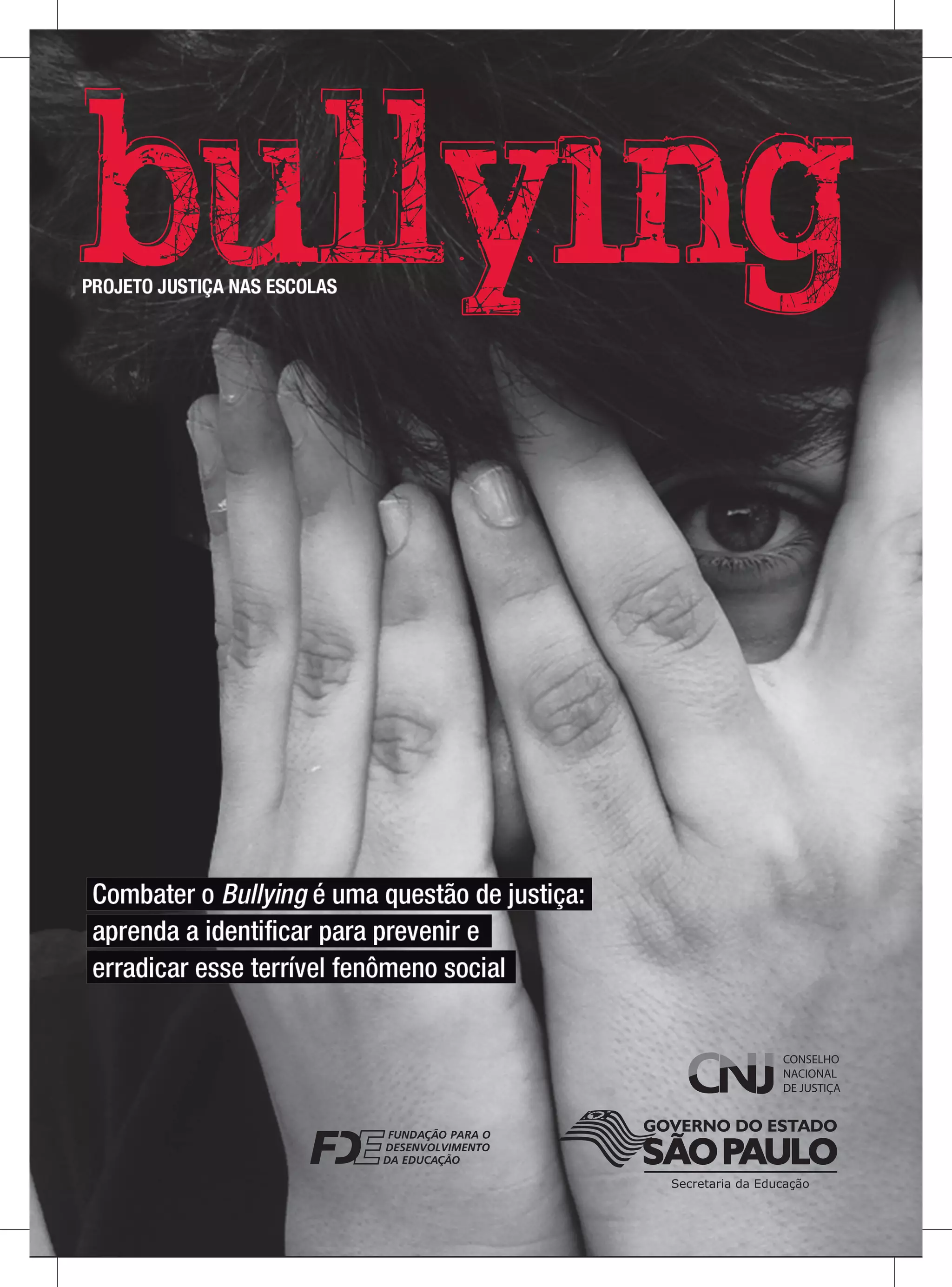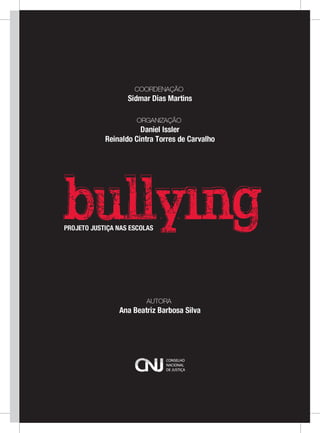 Este documento é uma cartilha produzida pelo Conselho Nacional de Justiça sobre bullying em escolas. A cartilha fornece informações sobre o que é bullying, suas formas, os perfis de agressores e vítimas, e os problemas que vítimas podem enfrentar. A cartilha tem o objetivo de ajudar professores e funcionários escolares a identificarem e prevenirem bullying no ambiente escolar.