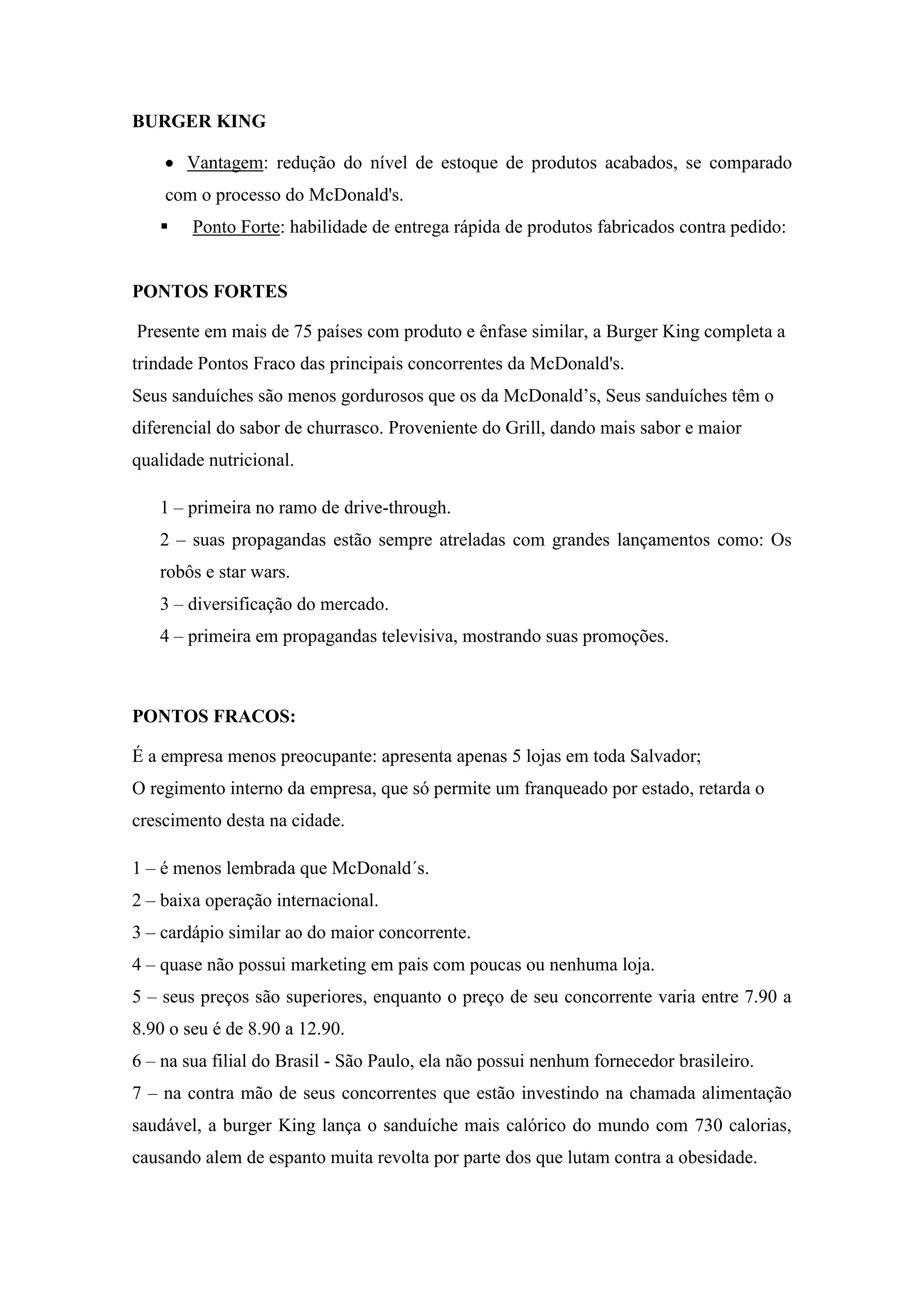 O documento descreve os pontos fortes e fracos das redes de fast food Burger King, McDonald's e Wendy's. Burger King se destaca por entregas rápidas contra pedido e sanduíches menos gordurosos que McDonald's. Seus pontos fracos incluem menor lembrança e preços mais altos. McDonald's é líder mundial conhecido por responsabilidade social e valorização de funcionários, enquanto foca clientes de classe média. Wendy's produz contra pedido com maior qualidade que Burger King e McDonald's, mas com tempo de produção maior.