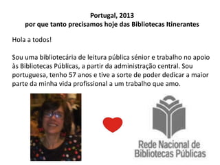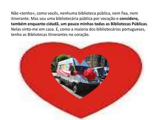 Este documento discute a importância das bibliotecas itinerantes em Portugal. Apresenta a história das bibliotecas itinerantes patrocinadas pela Fundação Calouste Gulbenkian entre 1960 e 1990, que levaram livros a todo o território português. Argumenta que as bibliotecas itinerantes são ainda essenciais hoje para combater a desertificação rural e problemas urbanos, ao proverem serviços culturais e de informação às comunidades isoladas. Defende a fusão das bibliotecas itinerantes com unidades móveis de saúde para melhor