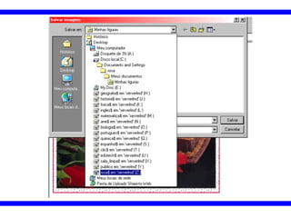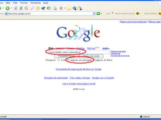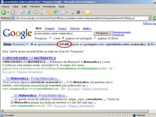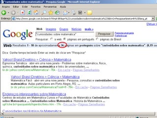 O documento descreve os principais recursos disponíveis na Internet, incluindo a World Wide Web para acessar informações multimídia, e-mail para trocar mensagens, FTP para transferir arquivos e sites de busca para pesquisas. Também fornece dicas sobre como realizar pesquisas e refinar resultados na Internet.