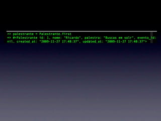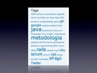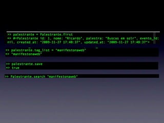 Ricardo Almeida apresenta Solr, uma engine de busca open source baseada no Lucene. Ele discute como Solr oferece performance, cache e replicação superior ao Sphinx. Também mostra como integrar Solr com Rails usando o plugin acts_as_solr para permitir buscas poderosas com facetas, geolocalização e atributos dinâmicos.