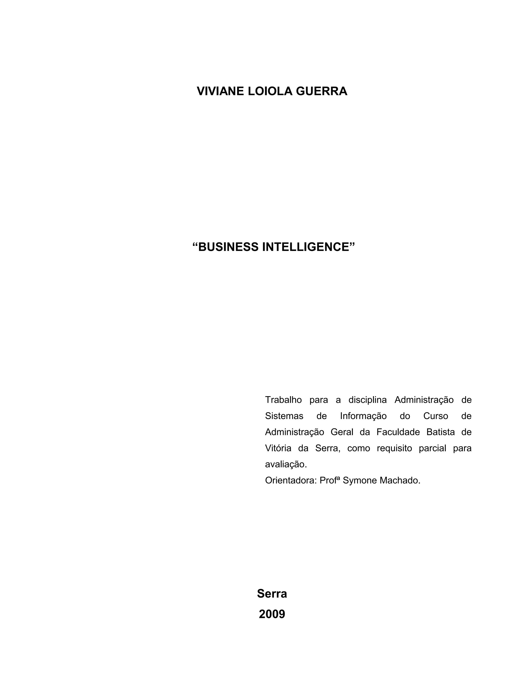 O documento descreve os principais aspectos do Business Intelligence, incluindo sua definição, tecnologias envolvidas e importância para tomada de decisões em empresas. Aborda conceitos como data warehouse, OLAP, data mining e casos reais de implementação de sistemas de BI.