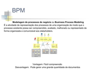O documento apresenta o Business Model Canvas como uma ferramenta de modelagem estratégica que organiza e representa os processos de negócios em nove blocos fundamentais. Cada bloco aborda diferentes aspectos, como segmentos de clientes, proposta de valor, canais, receitas e custos, facilitando a compreensão e o desenvolvimento de novos modelos de negócio. A aplicação dessa ferramenta promove a concepção de produtos e cria um entendimento comum entre os stakeholders envolvidos.