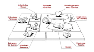 O documento discute os principais elementos do Modelo de Negócios Canvas, incluindo a segmentação de clientes com base em necessidades e canais diferentes, a proposta de valor para atender a esses segmentos, os canais de comunicação e vendas, e as parcerias e recursos necessários para fazer o modelo funcionar.
