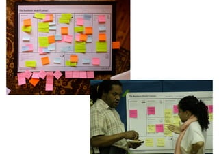 O documento aborda a geração de modelos de negócios com foco na inovação, destacando a diferença entre inovação e invenção. A ferramenta BMG Canvas é apresentada como essencial para startups, ajudando a mapear elementos chave como segmentos de clientes, propostas de valor e atividades essenciais para o sucesso do negócio. A importância de entender e ouvir os clientes é enfatizada, assim como a necessidade de adaptação contínua para atender às suas necessidades.