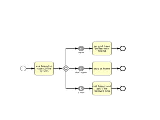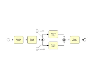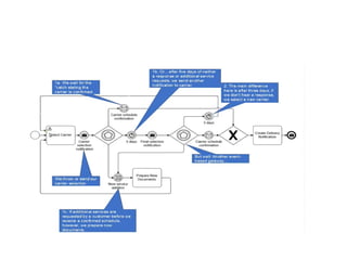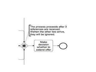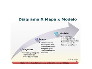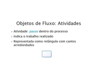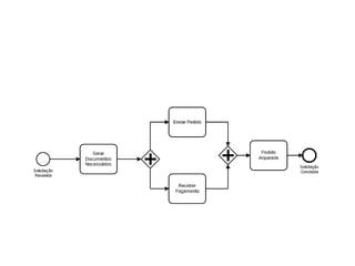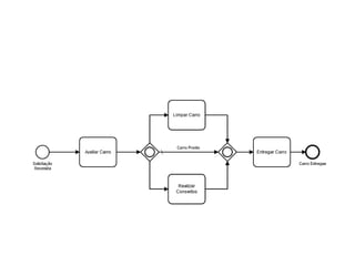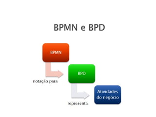 O documento aborda a notação gráfica BPMN (Business Process Modeling Notation) para a modelagem de processos de negócio, detalhando suas definições, componentes e ciclos de vida. Ele enfatiza a importância de promover uma notação padronizada e compreensível, que facilite a comunicação entre analistas, desenvolvedores e gerentes. Além disso, discute diversos tipos de diagramas e conceitos, como eventos, atividades e gateways, para melhorar a eficiência e eficácia organizacional.