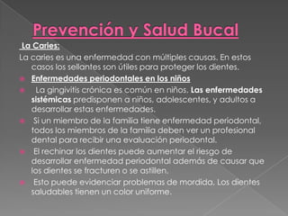 O documento discute vários tópicos relacionados à saúde bucal em crianças, incluindo cárie, doenças periodontais, sinais de quando levar uma criança ao dentista e hábitos de higiene dental para prevenir problemas. Recomenda visitas regulares ao dentista para limpezas, fluoretação e aplicação de selantes.