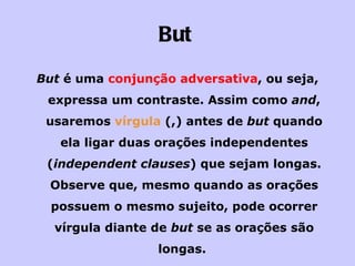 Este documento explica o uso das conjunções "but", "or" e "so" para conectar orações. "But" expressa contraste, "or" expressa alternância ou exclusão, e "so" expressa uma consequência ou resultado de algo. Exemplos ilustram como essas conjunções ligam orações independentes.