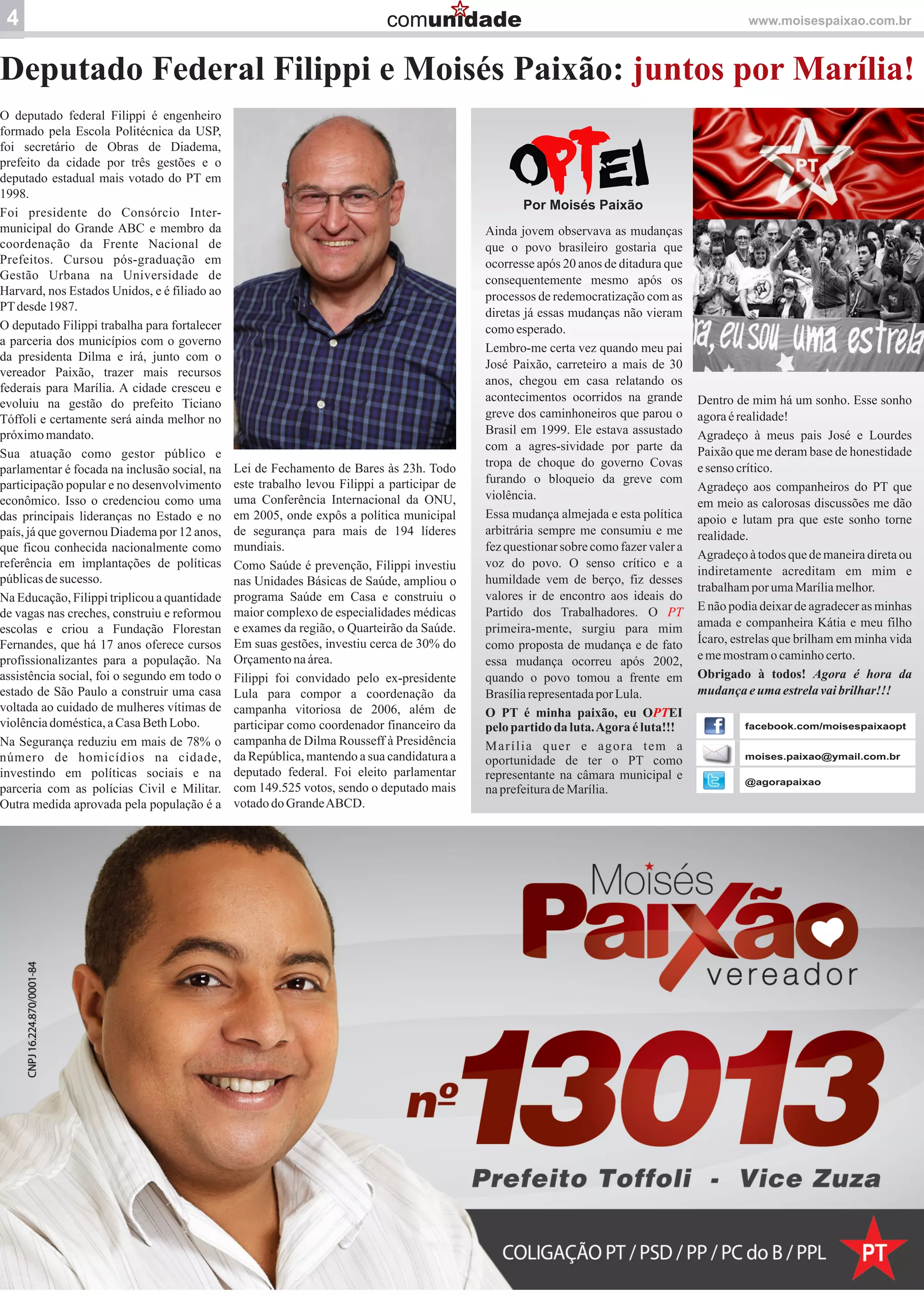 O deputado federal Filippi e o vereador Moisés Paixão estão trabalhando juntos para trazer mais recursos federais para a cidade de Marília. Filippi tem experiência como prefeito e deputado estadual e trabalha para fortalecer a parceria entre os municípios e o governo federal. Moisés Paixão é filiado ao PT e acredita que o partido representa a mudança desejada pelo povo brasileiro.