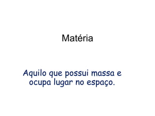Este documento apresenta conceitos fundamentais da física sobre matéria e energia. Aborda que matéria é aquilo que possui massa e ocupa espaço, definindo também massa, volume e densidade. Explica que átomos são constituídos de núcleos e elétrons e que elementos químicos são diferentes tipos de átomos. Por fim, diferencia entre átomos neutros e íons, quando átomos ganham ou perdem elétrons.