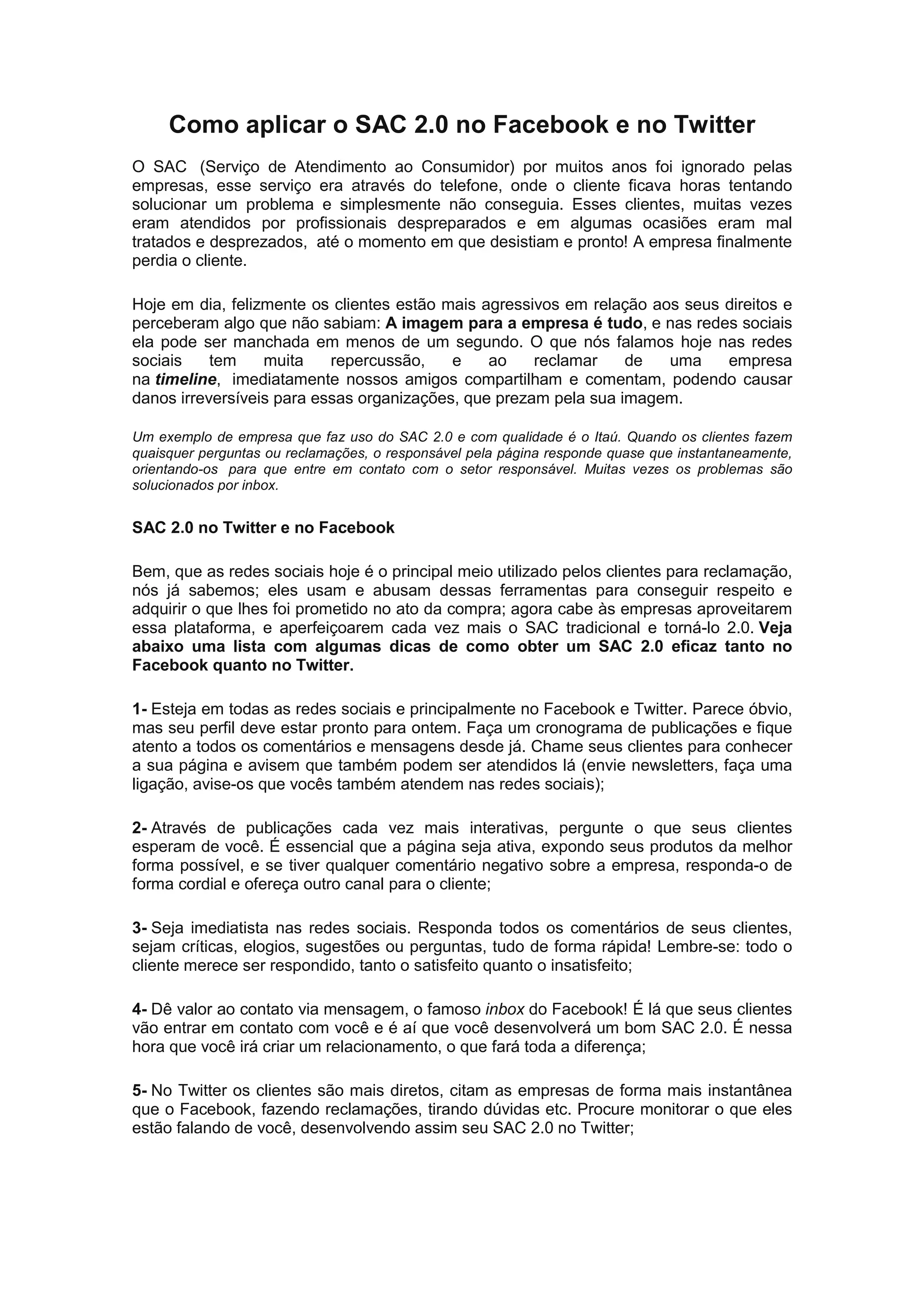 O documento discute como empresas podem implementar um Serviço de Atendimento ao Consumidor (SAC) 2.0 eficaz nas redes sociais Facebook e Twitter. Ele fornece dicas como estar ativo nas redes sociais, responder rápido a comentários e mensagens, compartilhar elogios de clientes, e desenvolver um relacionamento com os clientes para melhorar a satisfação e a imagem da marca. Também ressalta a importância de manter um bom SAC tradicional para clientes que não usam redes sociais.
