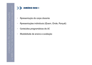 O documento apresenta a aula introdutória de uma disciplina sobre conteúdos audiovisuais para novos meios. Apresenta o corpo docente, os objetivos gerais, o programa, a avaliação e a modalidade de ensino, que será em blended learning.