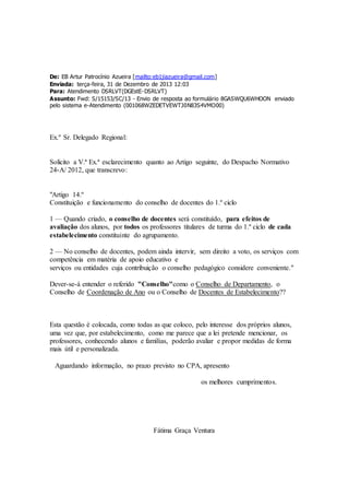 O documento discute a constituição e funcionamento do Conselho de Docentes do 1o ciclo de acordo com a legislação em vigor. O Conselho de Docentes deve ser composto por todos os professores titulares de turma do estabelecimento de ensino para efeitos de avaliação dos alunos. A carta solicita esclarecimento sobre se o "Conselho" mencionado na lei refere-se ao Conselho de Departamento, Conselho de Coordenação de Ano ou Conselho de Docentes do Estabelecimento.