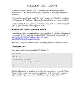 C# é uma linguagem de programação orientada a objetos derivada de C/C++ que faz parte da plataforma .NET da Microsoft. A linguagem possui recursos como coleta de lixo automática e tratamento de exceções que auxiliam na construção de softwares robustos. O documento apresenta os conceitos básicos de C# e mostra como escrever um programa "Olá Mundo" nesta linguagem.