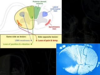 1) O paciente apresentou paralisia e alterações de sensibilidade em membros opostos, sugerindo uma lesão medular unilateral conhecida como Síndrome de Brown-Séquard.