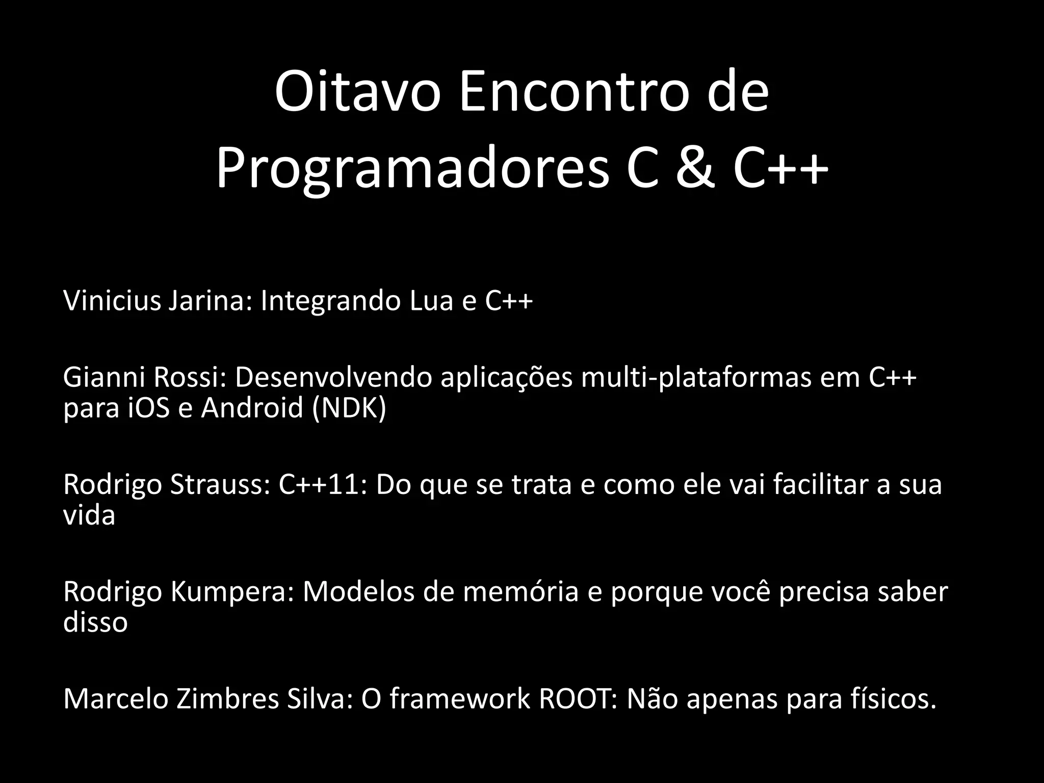 O evento discutiu novas funcionalidades do C++11 como lambdas, rvalue references e auto type deduction. Os palestrantes abordaram tópicos como integrar Lua e C++, desenvolvimento multiplataforma para iOS e Android, modelos de memória, e o framework ROOT para análise de dados. O último palestrante apresentou as principais mudanças trazidas pelo C++11 e como elas facilitam o desenvolvimento.
