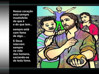 O documento discute como Jesus é o "Pão da Vida" que sacia verdadeiramente a fome humana. O povo procurava Jesus pelo pão milagroso, não entendendo seu verdadeiro significado. Jesus explica que ele mesmo é o pão que vem do céu e dá vida eterna, não apenas pão físico. A mensagem pede que busquemos em Jesus, e não apenas em milagres, o pão que sacia permanentemente nossa fome espiritual.