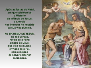 O documento descreve o batismo de Jesus no Rio Jordão e seu significado. O batismo revela Jesus como o Filho amado de Deus enviado para salvar a humanidade. Ao ser batizado, Jesus manifesta sua identidade como solidário com os pecadores e sua missão de trazer libertação.