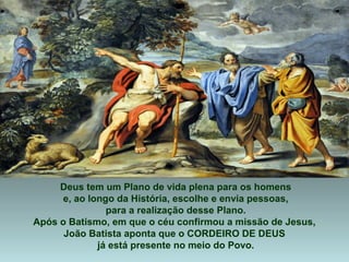 This document discusses God's plan of fullness of life for humanity and how God chooses people throughout history to fulfill this plan, such as Jesus and John the Baptist. It examines their vocations according to passages from Isaiah, Paul's letter to the Corinthians, and the Gospel of John. The key points are that Jesus is the Lamb of God who takes away the sin of the world and the Son of God, and that all Christians are called to witness to Christ and prepare others for their encounter with God.