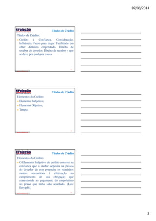 O documento discute títulos de crédito, definindo-os como documentos representativos de dívidas ou direitos que podem ser negociados. Explica que o crédito é baseado na confiança e permite o adiamento do pagamento. Detalha também os elementos subjetivo, objetivo e de tempo que compõem o crédito.