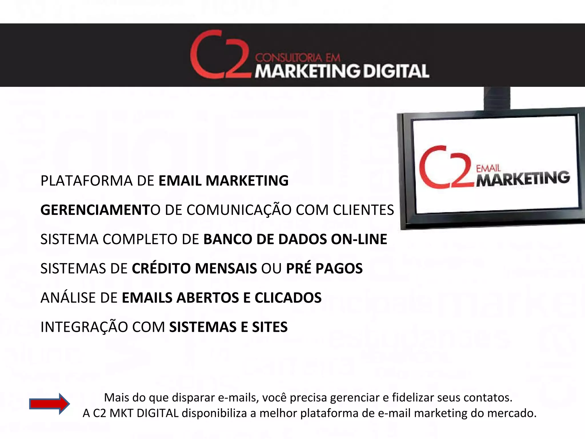 A C2 MKT Digital oferece uma plataforma completa de e-mail marketing, que facilita a gestão e fidelização de contatos através de um sistema acessível e de fácil uso. O processo é dividido em três etapas: inserção de contatos, criação de mensagens personalizadas e envio com análise de estatísticas em tempo real. O sistema ainda inclui vantagens como eliminação de e-mails inválidos, limites flexíveis de uso e verificação anti-spam para otimização das campanhas.