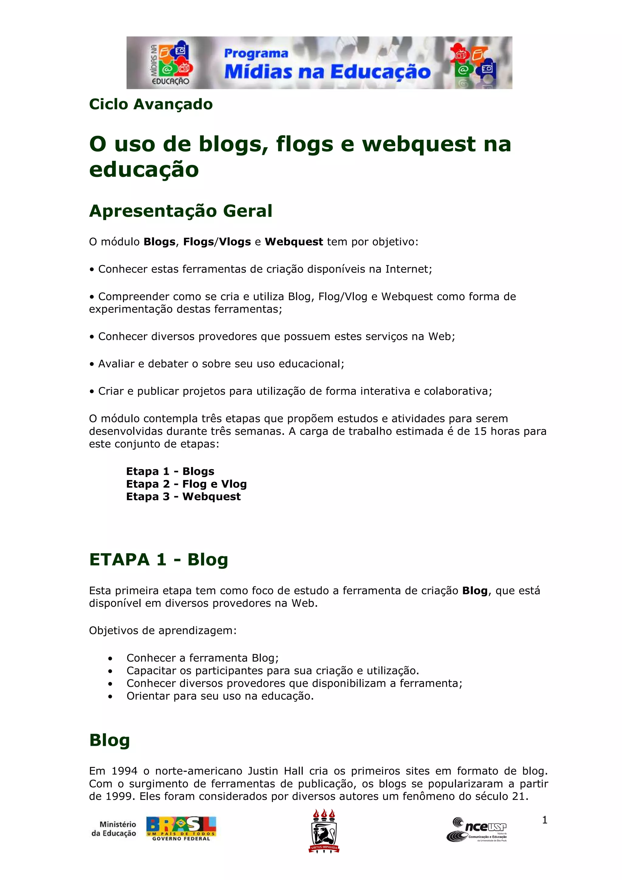 O documento apresenta um módulo educacional sobre o uso de blogs, flogs e webquest. O módulo é dividido em três etapas, sendo a primeira sobre blogs, a segunda sobre flogs e vlogs, e a terceira sobre webquest. Cada etapa apresenta objetivos, definições das ferramentas, exemplos educacionais e links para recursos adicionais. O documento fornece informações detalhadas sobre como estas ferramentas podem ser usadas para fins educacionais de forma interativa e colaborativa.