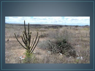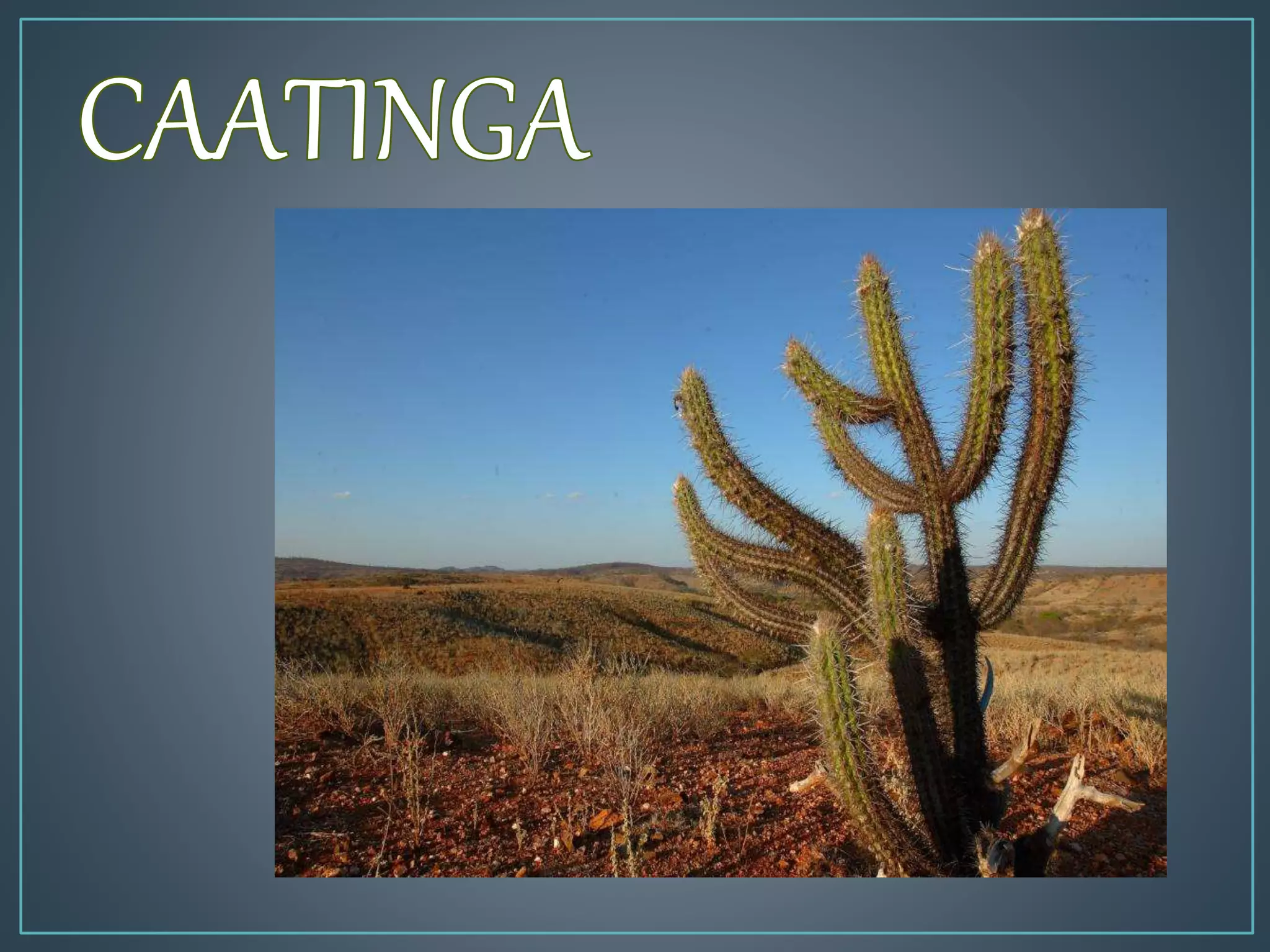 A Caatinga é um bioma localizado no nordeste do Brasil, caracterizado por um clima quente e seco e vegetação espinhosa. Abrange dez estados e ocupa uma área de 844 mil quilômetros quadrados, com espécies vegetais adaptadas à sobrevivência no período seco, como cactos. Sua biodiversidade inclui centenas de espécies de animais, porém a expansão agrícola e a exploração de recursos naturais ameaçam esse ecossistema.
