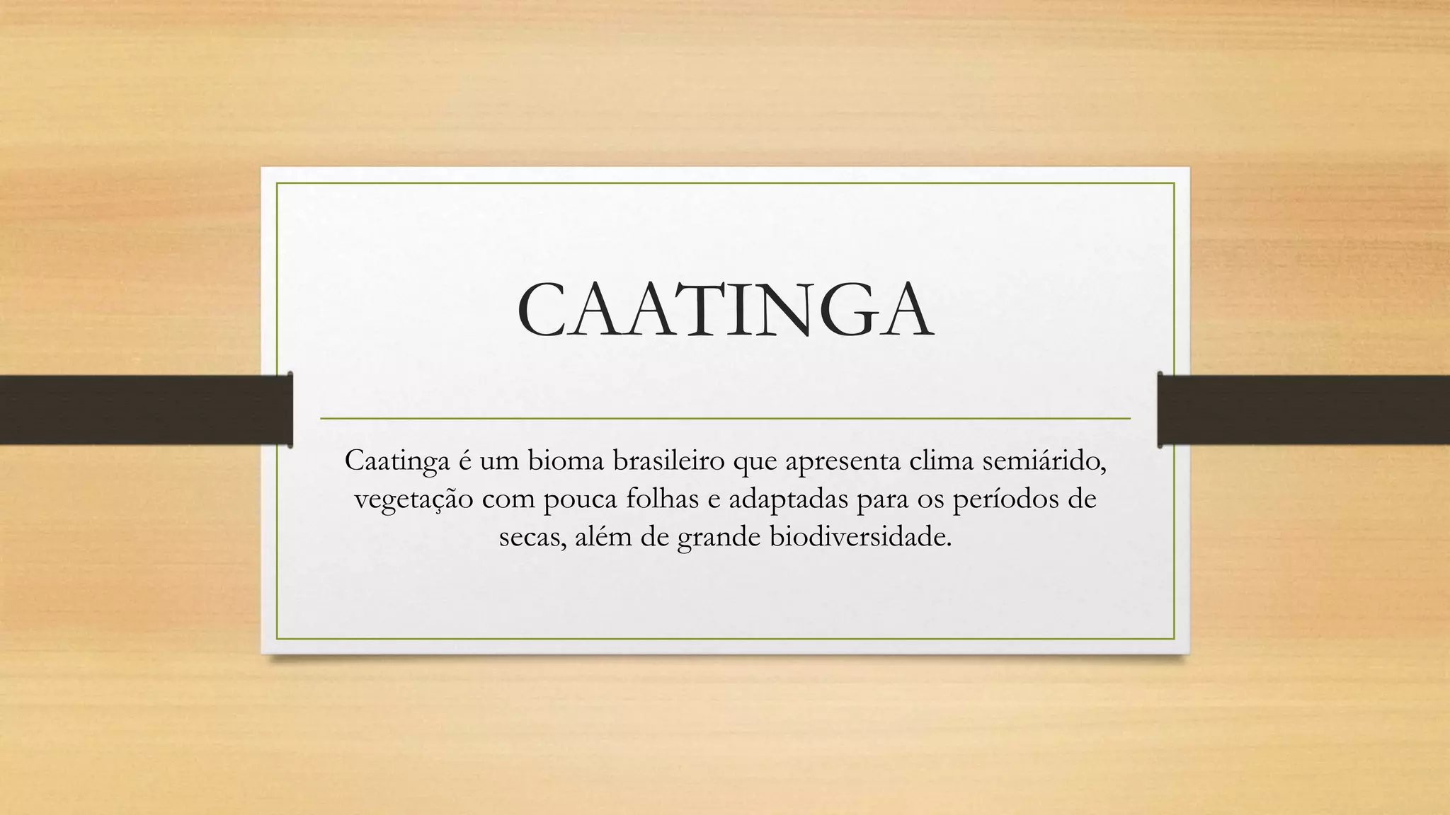 A Caatinga é um bioma brasileiro semiárido localizado principalmente no Nordeste, caracterizado por vegetação adaptada a longos períodos de estiagem e clima quente e seco. Apesar das condições adversas, abriga grande biodiversidade de plantas e animais adaptados ao clima, porém muitas espécies estão ameaçadas pelo desmatamento e degradação ambiental.