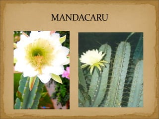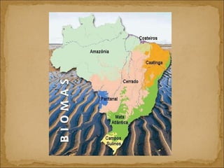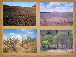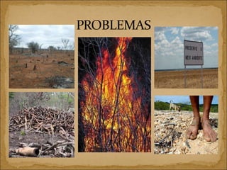 O documento descreve o bioma da Caatinga no nordeste do Brasil, incluindo sua localização, características, flora, fauna e principais problemas ambientais. A Caatinga cobre uma área de 73,6 milhões de hectares em 10 estados nordestinos, com vegetação adaptada ao clima quente e seco e espécies como cactos, aroeiras e juazeiros. Muitos ecossistemas originais já foram substituídos e a biodiversidade está ameaçada por desmatamento, queimadas e atividades como pecuária