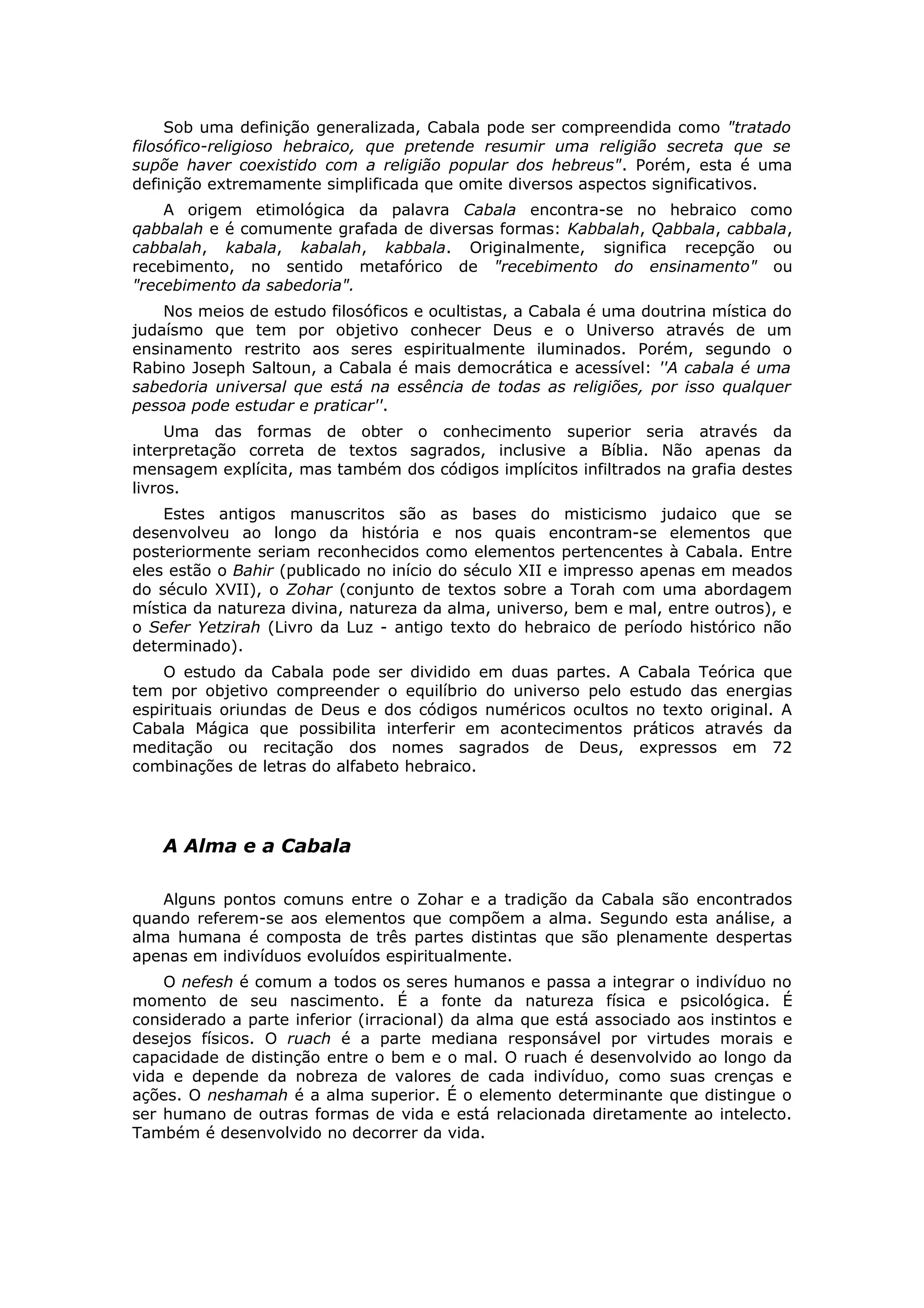 A Cabala é uma doutrina mística judaica que busca conhecer Deus e o universo através de ensinamentos secretos. Ela analisa a alma humana como composta de três partes e pode ser usada para compreender origens espirituais e físicas. Ao longo dos séculos, a Cabala se conectou a outras tradições esotéricas e é hoje popularizada através de cursos sobre a Árvore da Vida.