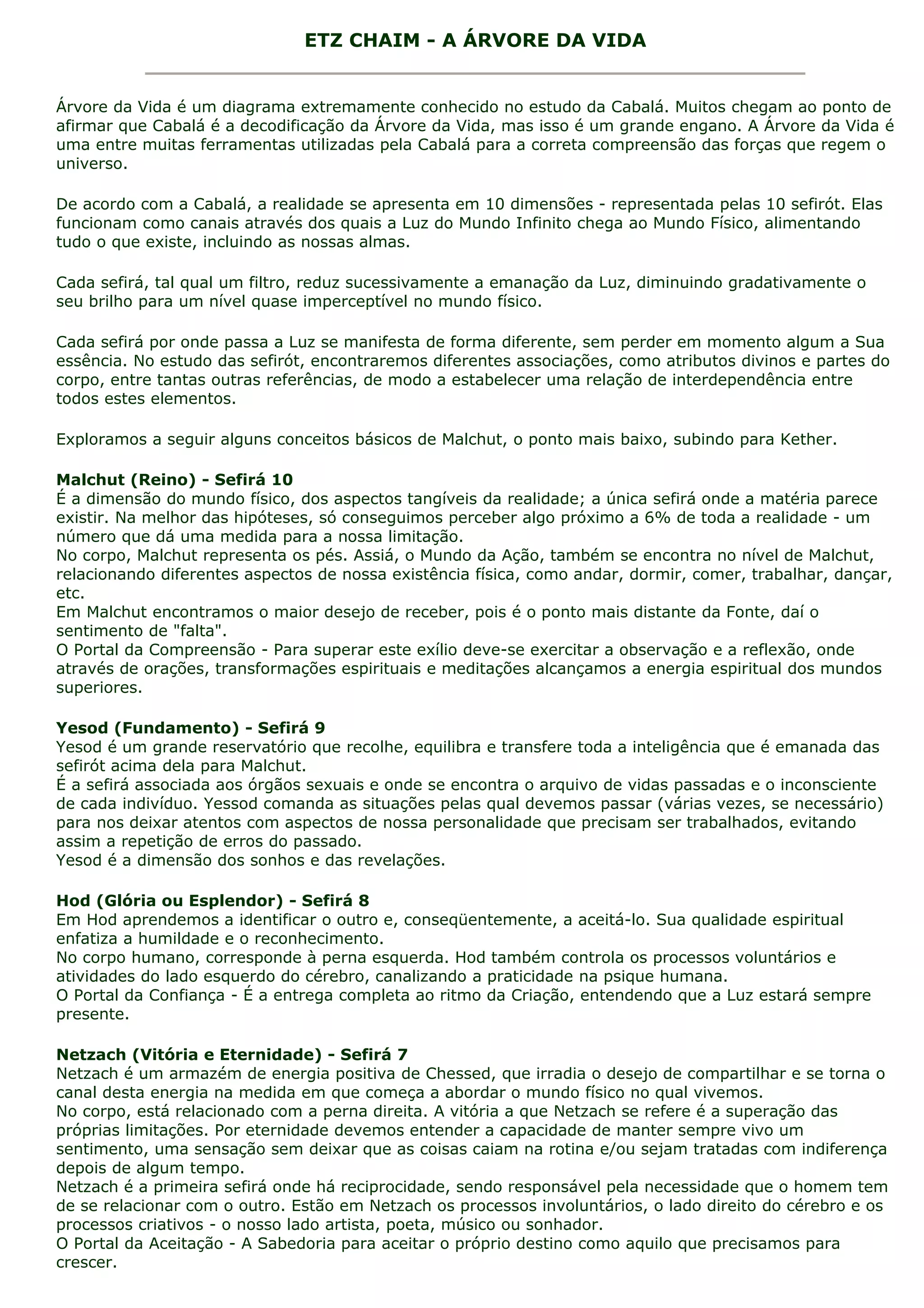 O documento descreve a Árvore da Vida da Cabalá, que representa a realidade em 10 dimensões chamadas sefirót. Cada sefirá reduz sucessivamente a Luz do Criador à medida que desce na árvore, manifestando-se de forma diferente. O texto explora cada sefirá, associando-as a partes do corpo, atributos divinos e conceitos espirituais.