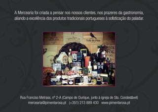 A mercearia Pimenta Rosa oferece uma variedade de produtos gourmet portugueses e internacionais, incluindo enchidos, queijos, vinhos e cabazes personalizados. Localizada em Campo de Ourique, a mercearia enfatiza a qualidade e a autenticidade dos seus produtos, disponíveis em diferentes combinações para presentes ou consumo próprio. Os cabazes são temáticos e incluem opções específicas para o Natal, permitindo personalização conforme o gosto do cliente.