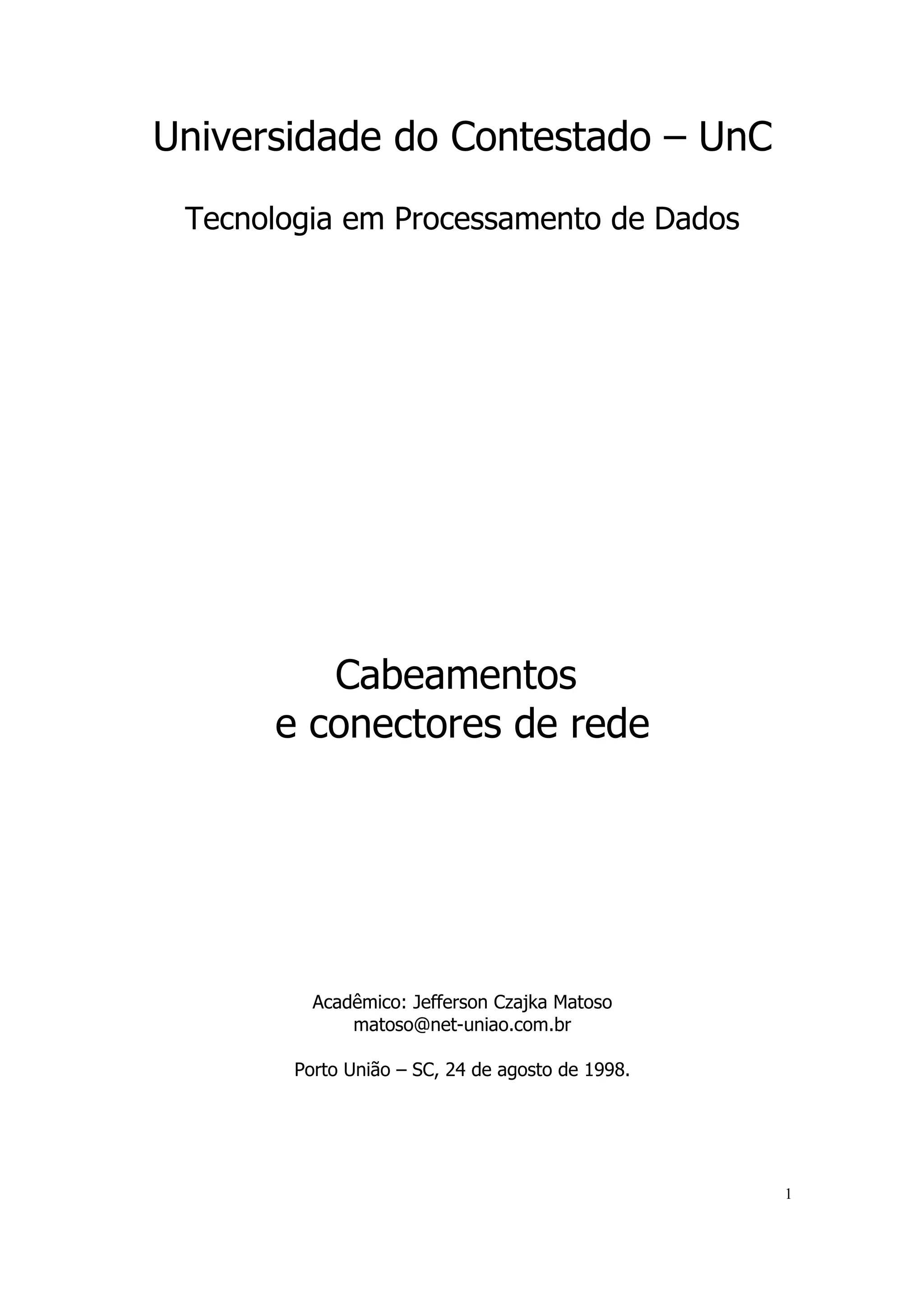 1) O documento discute os tipos de cabeamento para redes, incluindo cabo coaxial, par trançado e fibra óptica.